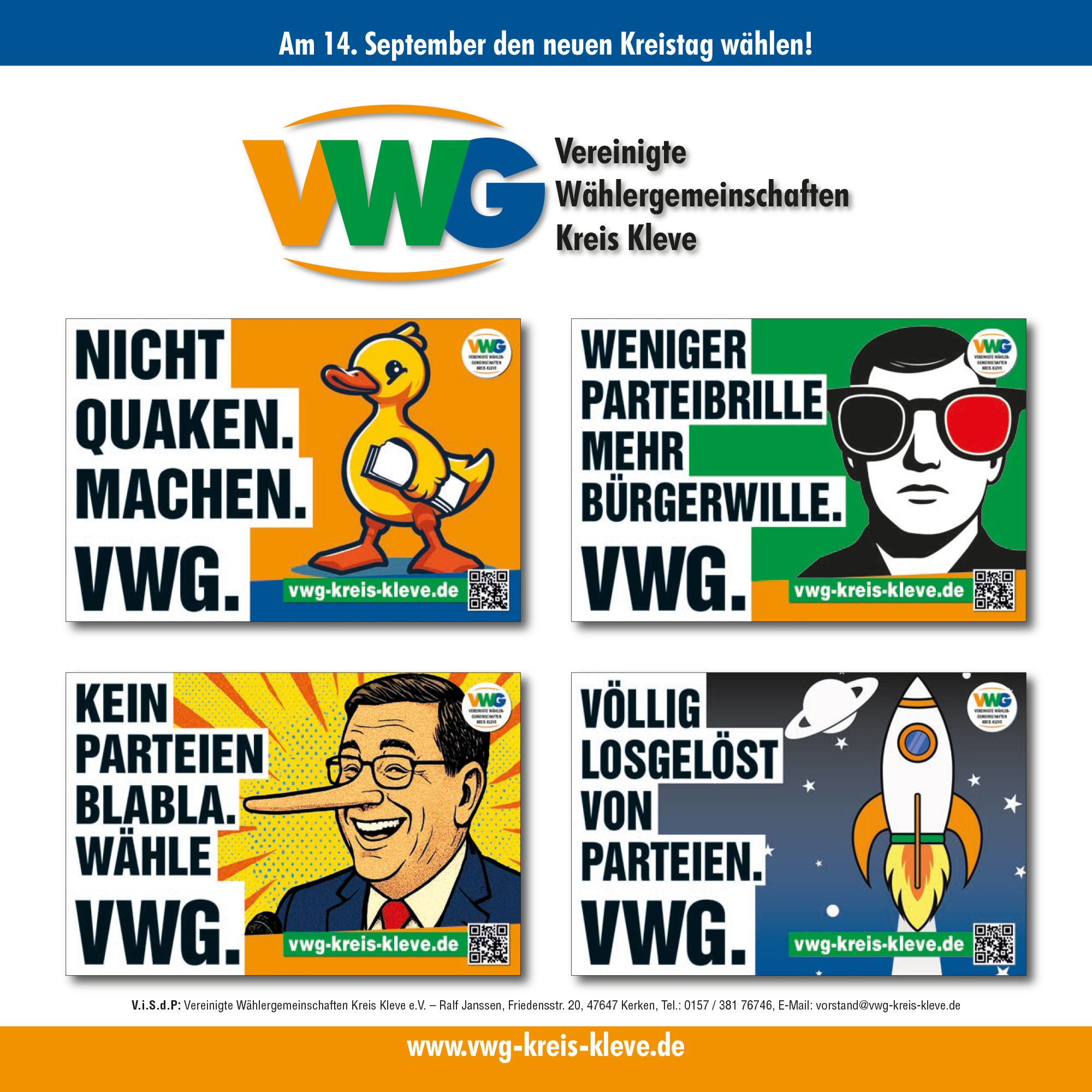 Die Vereinigten Wählergemeinschaften (VWG) setzen sich für eine Politik ein, die die Menschen im Kreis Kleve ernst nimmt, mitnimmt und einbindet. Bürgernähe heißt für uns: zuhören, verständlich kommunizieren und aktiv mitgestalten lassen. Verwaltung muss nachvollziehbar, serviceorientiert und digital erreichbar sein – für alle.